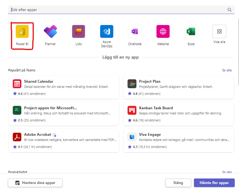 Välj Power BI: I dialogrutan som visas, välj ”Power BI” från listan över tillgängliga appar.