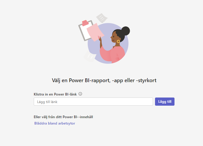 När du har valt att lägga till Power BI-innehåll i en Teams-kanal kan du välja mellan två huvudsakliga sätt att integrera innehållet: via URL eller genom att navigera via arbetsytor. Att addera via URL är bra när du redan har den exakta URL:en till rapporten, styrkortet eller appen du vill dela. Ett mer interaktivt sätt är att addera via arbetsytor, då får du välja från en lista över rapporter och appar. Det gör du så här: